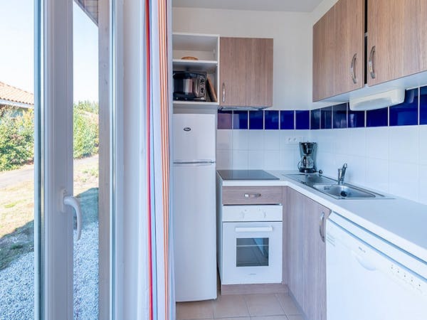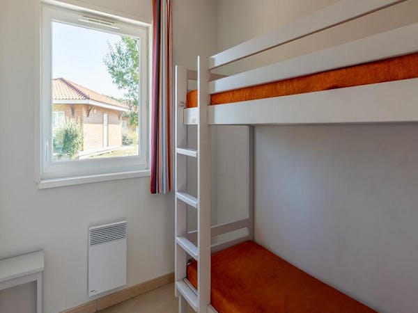 Villa for 6 people with 1 bedroom with a double bed, 1 bedroom with twin bed, 1 bedroom with bunk beds, bathroom, toilet, living room and an equipped kitchen.